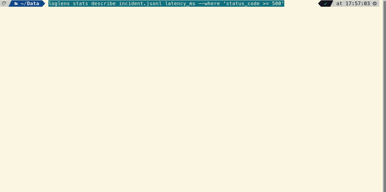 loglens stats describe incident.jsonl latency_ms --where 'status_code >= 500'