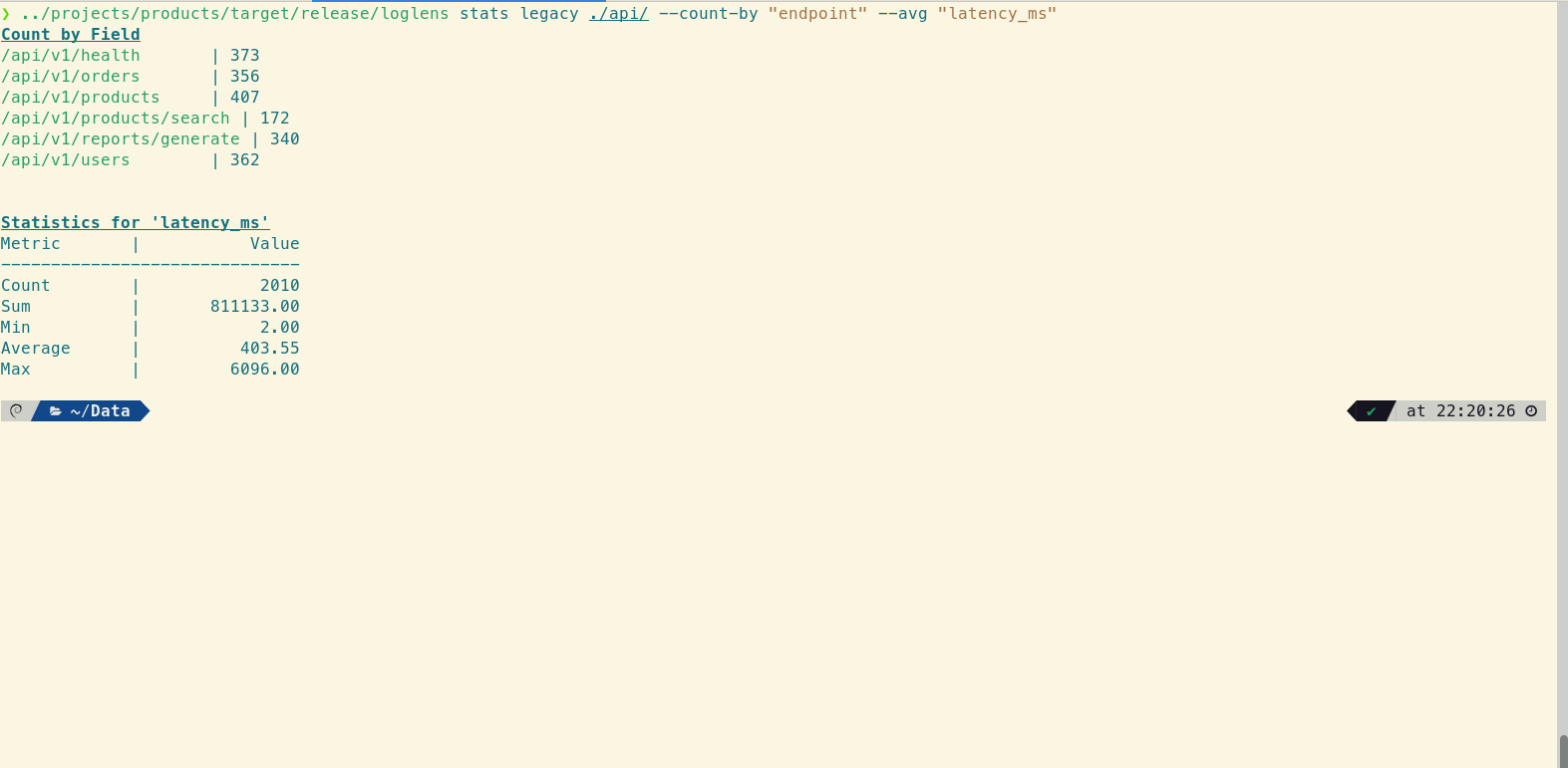 loglens stats legacy ./api/ --count-by "endpoint" --avg "latency_ms"