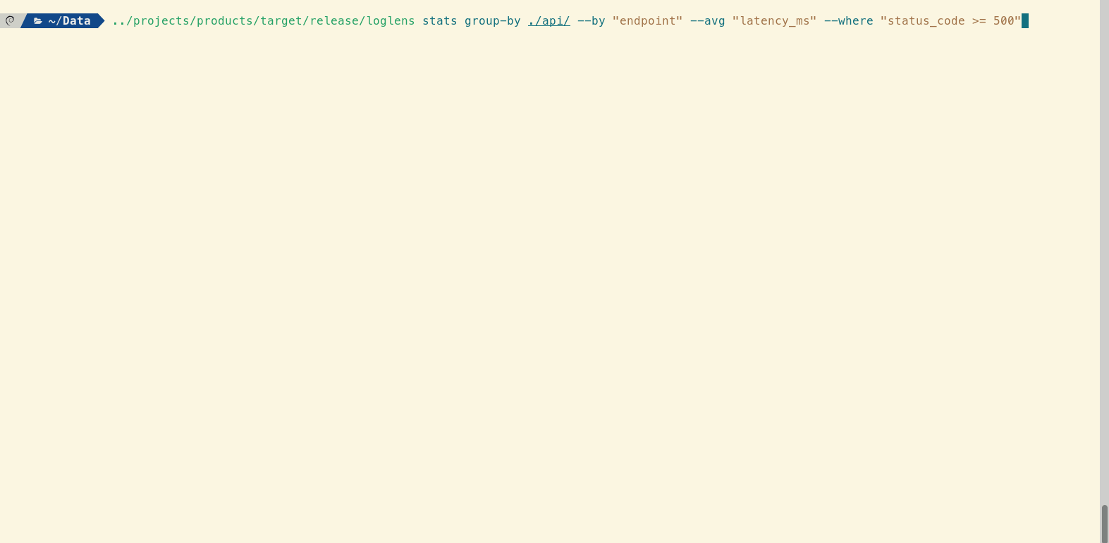 loglens stats group-by ./api/ --by "endpoint" --avg "latency_ms" --where "status_code >= 500"